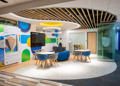 UCD Singapore Global Lounge is a dedicated hub offering a bespoke space for UCD students, faculty, alumni, and the wider UCD community to build connections at Level 2, Wilkie Edge in Singapore. With a student social media zone, student device charging points, and an acoustic phone pod, the hub is a vibrant, centralised space designed to support students' academic, social, and personal development. Staffed by a UCD team, the lounge is a welcoming place for UCD students, providing access to study areas and academic support whilst also offering spaces for group work and collaboration. Beyond academics, the Lounge fosters community hosting social events, clubs, and networking opportunities, helping students build connections and feel engaged. Overall, the UCD Global Lounge serves as a dynamic inclusive environment that enhances the student experience and exemplifies the UCD College of Business mission to empower, connect, and create.