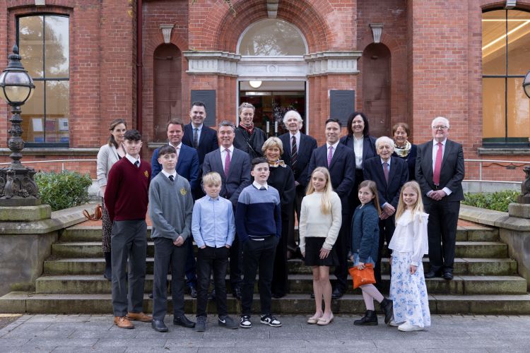 The Hillery Family, Professors Aidan Kelly, Anne Keegan and Bill Roche in front of the Smurfit Building