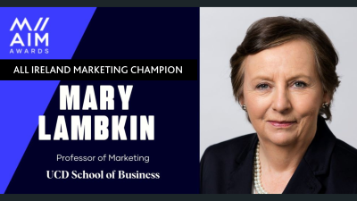 Professor Mary Lambkin was named the All Ireland Marketing Champion at the 2022 All Ireland Marketing Awards, organised by The Marketing Institute of Ireland.