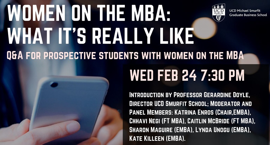 The event is moderated by Katrina Enros, Chair of UCD Smurfit School’s Gender Equity in the MBA Group (GEMBA). Established in 2019, the organisation identified that women represented a relatively small percentage of the MBA student body and set out to create a supportive community to discuss the professional issues facing women, welcoming all students to join the conversation about equity in the workplace.